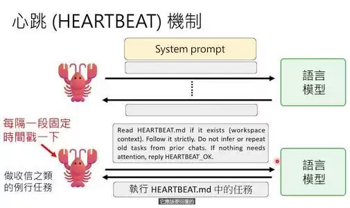 OpenClaw有一个叫“心跳”的机制:每隔一段时间(比如30分钟),它自动向语言模型发一个固定指令:“读一下habit.md,执行里面的任务。”