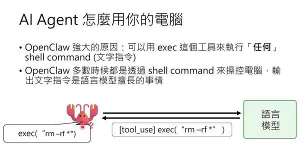 但这也带来了一个潜在风险——OpenClaw最强大的工具叫exec,可以执行任何shell命令。如果语言模型突然发疯,让它执行“rm -rf”清空硬盘,OpenClaw也会照做不误,因为它没有智能,只会执行指令。