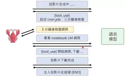 这个机制还有一个妙用:让AI学会等待。比如小金去NotebookLM生成投影片,需要等3-5分钟。如果只是普通对话,它看到“投影片生成中”就只能回报这个信息,任务就断了。但有了Cron Job,它可以在发现“生成中”时设置一个3分钟后的任务,3分钟后再来检查,如果投影片好了就下载。这样,AI就能处理需要等待的复杂任务了。