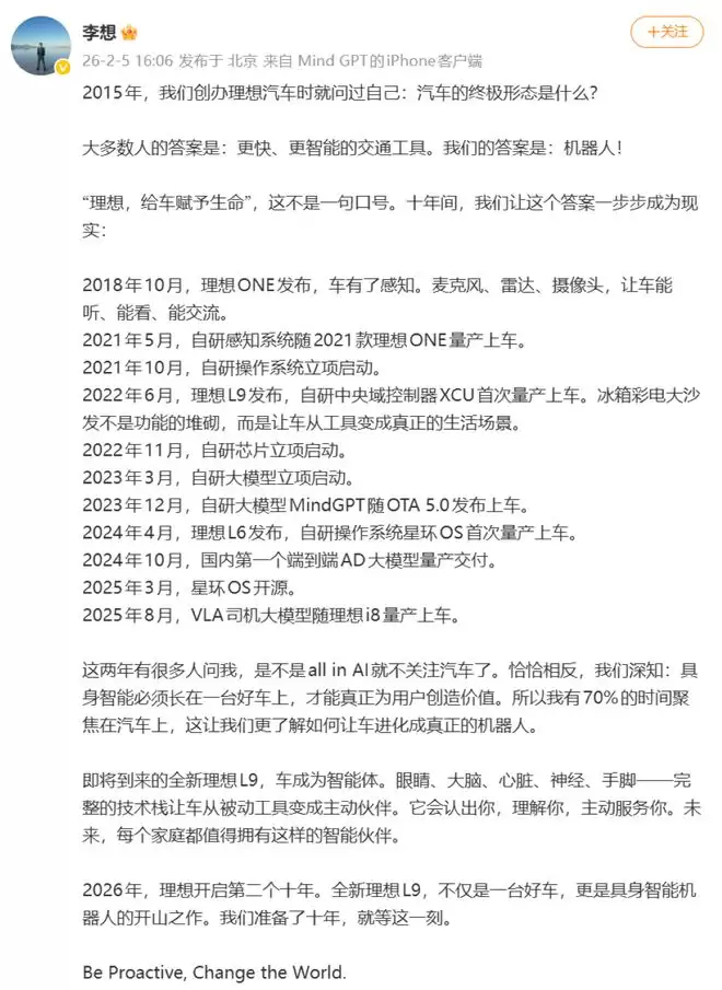 在刚刚过去的2025年,理想汽车不仅完成了从汽车企业向具身智能企业的全面重构,更是在充满挑战的市场环境中,为下一阶段的竞争打下了坚实的基础。