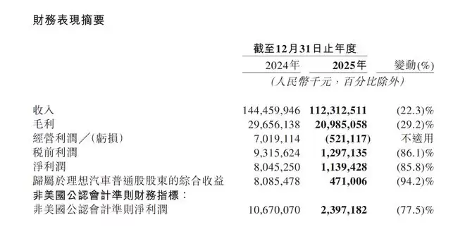 营收方面,理想汽车2025年总收入为人民币1123亿元,较2024年的1445亿元减少22.3%。在车辆销售收入方面,理想汽车2025年营收为1067亿元,较2024年减少23%。