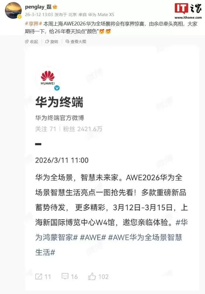 华为智选车产品总监彭磊在社交平台发文透露,于本周开幕的上海AWE 2026华为全场景展会上,享界系列将带来惊喜,且该惊喜将由余总牵头亮相。结合行业信息推测,此处的余总大概率是华为常务董事、产品投资评审委员会主任、终端BG董事长余承东。