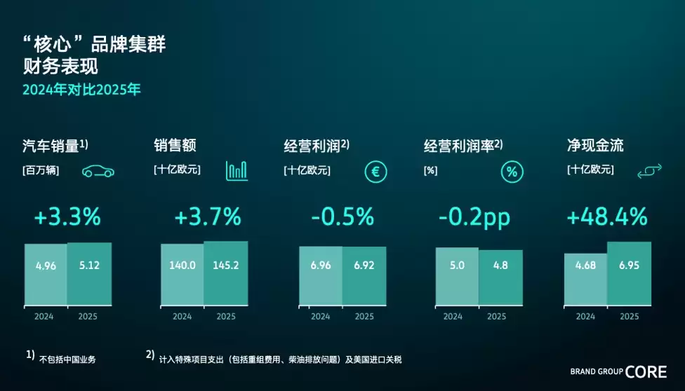 大众汽车集团“核心”品牌群在2025年展现出强劲的韧性。尽管面临多重市场挑战,集团仍通过战略调整与效率提升实现了稳健增长。全年汽车销量达到512万辆,同比增长3.3%,销售额攀升至1452亿欧元,增幅为3.7%。经营利润因重组成本、柴油排放事件及美国关税等特殊因素影响,微降至68亿欧元,但剔除这些因素后可达82亿欧元,与既定目标高度契合。