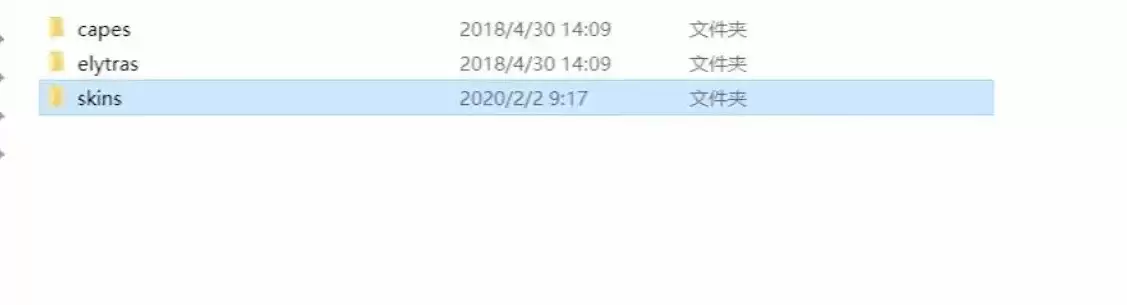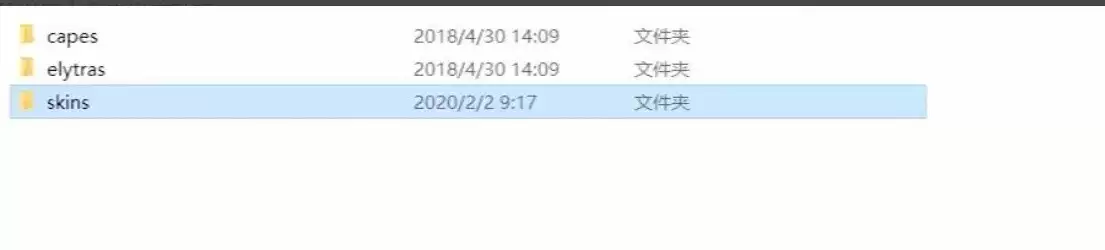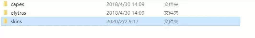 这个目录下有三个文件夹:第一个放披风,第二个放鞘翅,第三个才是放皮肤的地方。我们点击进入第三个文件夹。