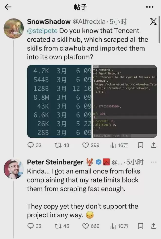 【腾讯回应OpenClaw之父Peter的“抄袭”指责:希望继续支持生态】近日,腾讯的SkillHub正式上线,有市场声音称腾讯正在抓取Clawhub上的技能并导入到该平台中。奥地利知名程序员、OpenClaw创始人PeterSteinberger在社交平台上评论,他曾收到一封邮件,有人抱怨他的速率限制导致他们无法快速抓取数据。“他们抄袭,却不以任何方式支持这个项目”。腾讯已在该条推文下进行回复,表示SkillHub只是面向中国用户的本地镜像站,标注ClawHub为原始来源;同时,腾讯上线首周给用户分发了180GB(87万次下载),但从最新源只拉取约1GB,反而帮最新分担了流量。此外,团队成员本身也是项目代码和PR贡献者,希望继续支持生态。(21财经)