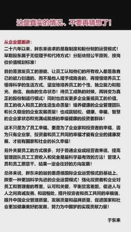 【于东来:不要再猜想了,胖东来追求的是靠制度和股份制的运营模式】3月11日,胖东来创始人于东来在社交平台发文回应公司分配制度。于东来表示,二十六年以来,胖东来追求的是靠制度和股份制的运营模式。早期股东属于无偿赠予和代持方式。分配依照公平原则,按岗位价值规划标准。“目的是激发员工的潜能、让员工认知他们的所有收入都是靠自己的能力创造的、而不是他人赠予或施舍的。”于东来透露,待员工在这种文化中成熟后,企业再转变为真正的股份制运行模式。(大象新闻)