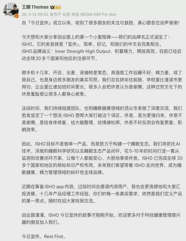 【小米前高管王腾公布新公司品牌名,正筹备ISHOapp内测】3月12日,小米前高管王腾发文宣布新公司“今日宜休”品牌名:ISHO,发音“宜休”,目前已启动全球20多个国家和地区的注册环节。他还透露,近期在筹备ISHOapp内测,过段时间会邀请内测用户。(驱动之家)
