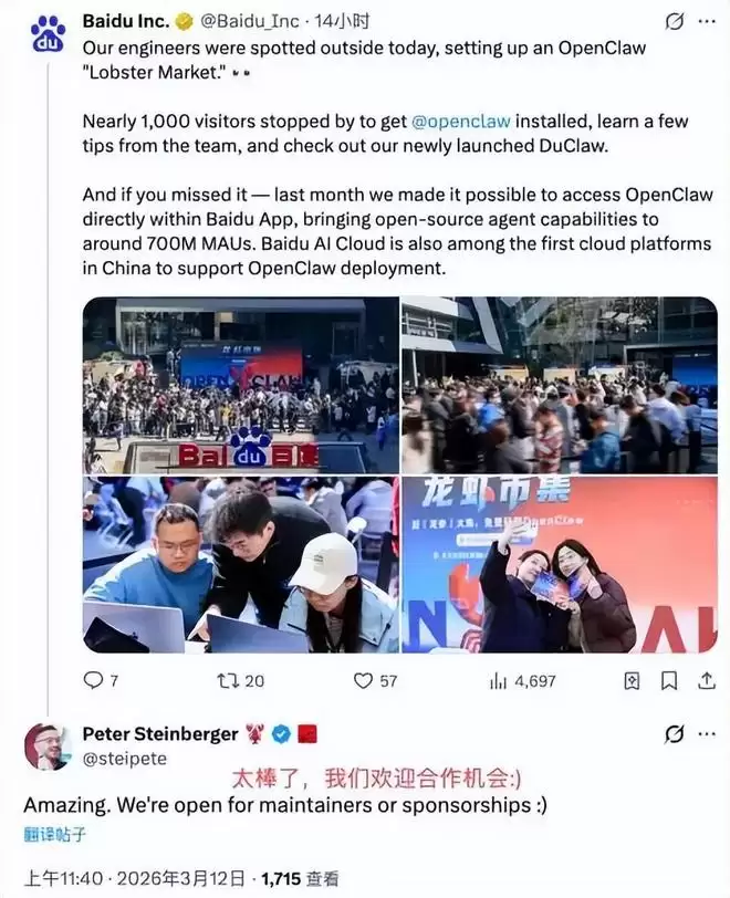 【全球首款手机龙虾上线,OpenClaw创始人称愿与百度共同开发龙虾】3月12日,百度发布了全球首款手机龙虾应用——“红手指Operator”,用户下载App其即可实现手机“养虾”。12日11点时许,OpenClaw创始人PeterSteinberger在海外社交平台上连发两条回复,称中国AI创新速度“Amazing”,并表示愿与百度共同开发龙虾。(证券时报)