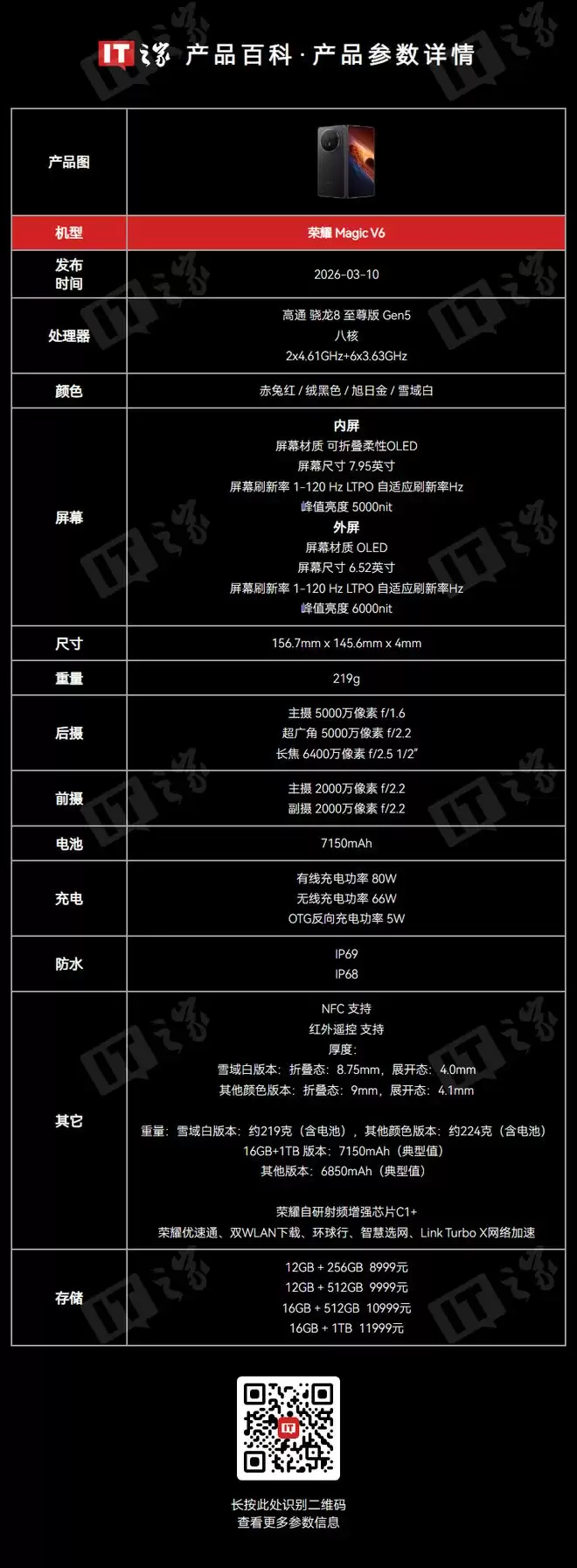 荣耀Magic V6提供赤兔红(绒马环环保皮)、旭日金、雪域白、绒黑色四款配色。雪域白版本展开厚度4mm、折叠厚度8.75mm、重量219g,其他版本展开厚度4.1mm、折叠厚度9mm、重量224g。支持荣耀鸿雁通信(1TB版本额外支持北斗卫星通信),具备IP68 & IP69双重防尘防水认证,搭载MagicOS 10智能操作系统。