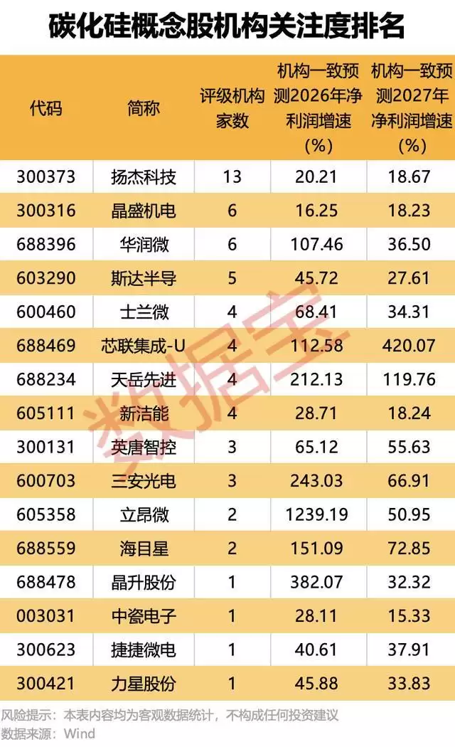 从机构评级来看,有16股获得机构关注,扬杰科技、晶盛机电、华润微、斯达半导等关注机构数量居前,均在5家及以上。