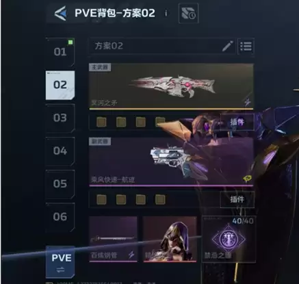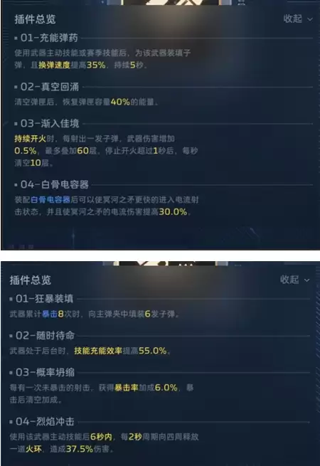 这里2号插件的选择与纯白有所不同,冥河之矛必须配备真空回涌,而非无限续弹。要等待打空子弹触发换单动作,在能量恢复后立即使用乘风技能打断换弹,继续输出。切记要在打空子弹且能量恢复后再使用乘风,这样基本21秒就能完成充能,实现21秒一次大招循环。另外4号位需要携带专属插件,