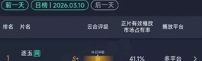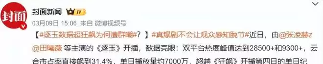 更值得警惕的是,该剧不止剧情失衡,还在宣发端频频“注水造势”。此前有营销号宣称其单日播放量碾压《狂飙》,结果被网友逐帧比对发现:所谓“超越”,竟是拿《逐玉》首播次日数据,对比《狂飙》播出第四天的峰值曲线。