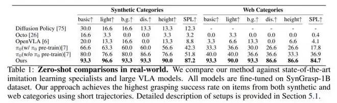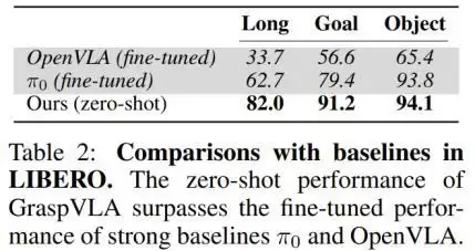其中,GraspVLA结合海量仿真合成数据,实现了对光照、干扰物的零样本(Zero-shot)真机泛化,其真实抓取成功率显著超越了OpenVLA与Octo等主流大模型。