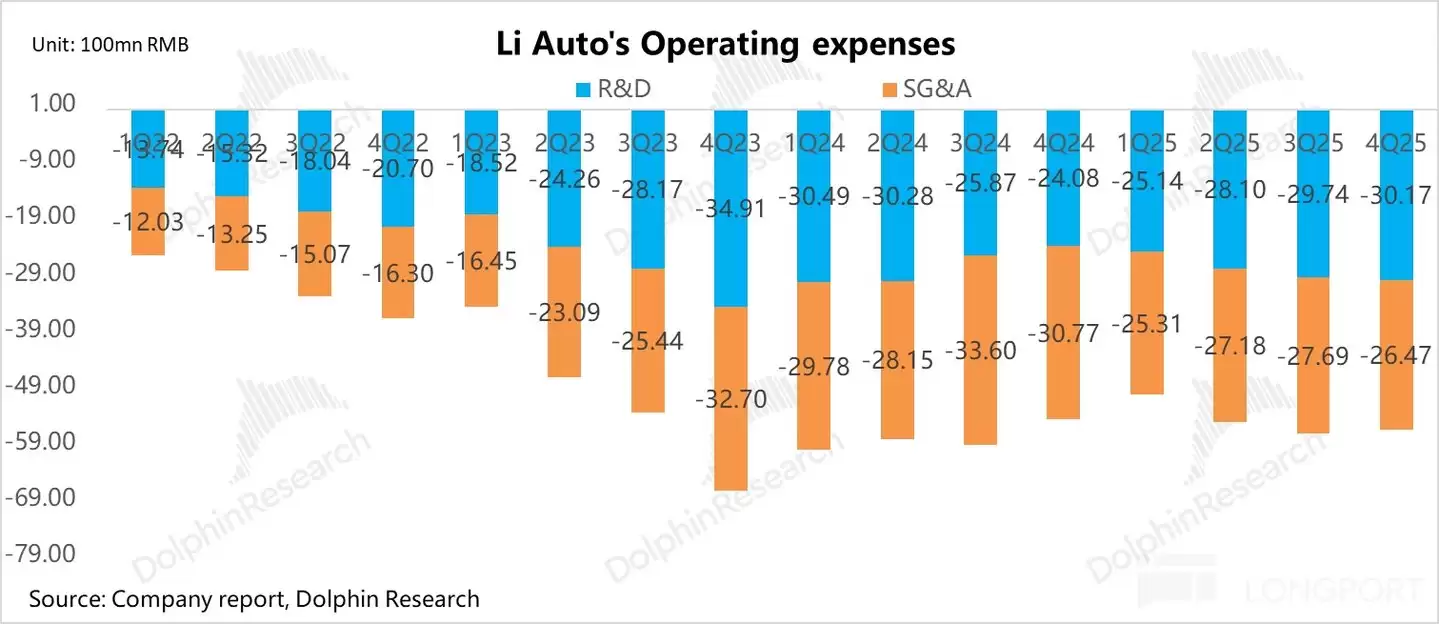 基于上述大幅下行的均价预期,以及一季度仍然相对疲软的销量(Q1销量环比25Q4下滑17%-22%,导致单车分摊的固定成本上升,规模效应减弱),再叠加近期上游锂电、存储芯片等大宗原材料涨价对BOM成本的反噬,海豚君预计理想一季度的车辆毛利率预计还要环比继续走低,低于市场预期的16.8%(25Q4水平),而具体指引仍需密切关注管理层在业绩会上的表述。