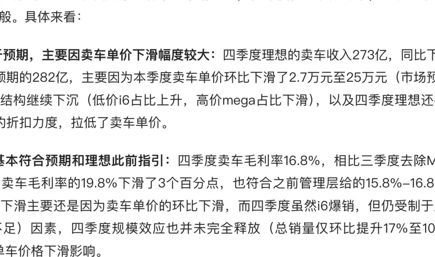 ① 收入端略低于预期,主要因卖车单价下滑幅度较大:四季度理想的卖车收入273亿,同比下滑36%,低于市场预期的282亿,主要因为本季度卖车单价环比下滑了2.7万元至25万元(市场预期25.8万元),车型结构继续下沉(低价i6占比上升,高价mega占比下滑),以及四季度理想还在加大对老款L系列的折扣力度,拉低了卖车单价。