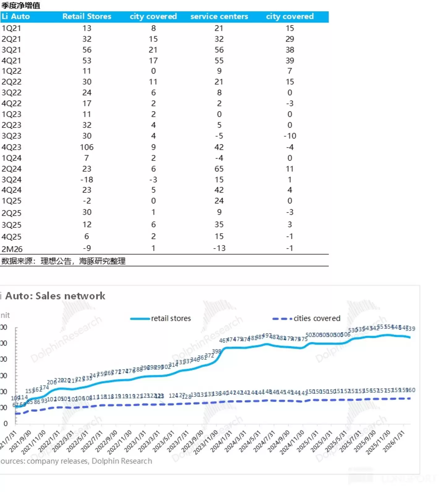 本季度销售和管理费用26.5亿,环比下滑1.2亿元,低于市场预期的27.4亿元,可能主要因为a. 四季度理想对营销部门进行了一定的裁员,营销部门合并后,直营门店一线销售淘汰 15%),缩减了薪酬开支;b. 新车上市相关的营销费用投入的减少(主要集中在三季度);c. 新增渠道铺设上,理想已经从前期的“激进扩张”转向“谨慎经营”。四季度,全国仅新增 6 家零售中心和 15 家服务中心。而进入 2026 年一季度后,理想甚至裁撤并优化部分低效门店来降低成本。