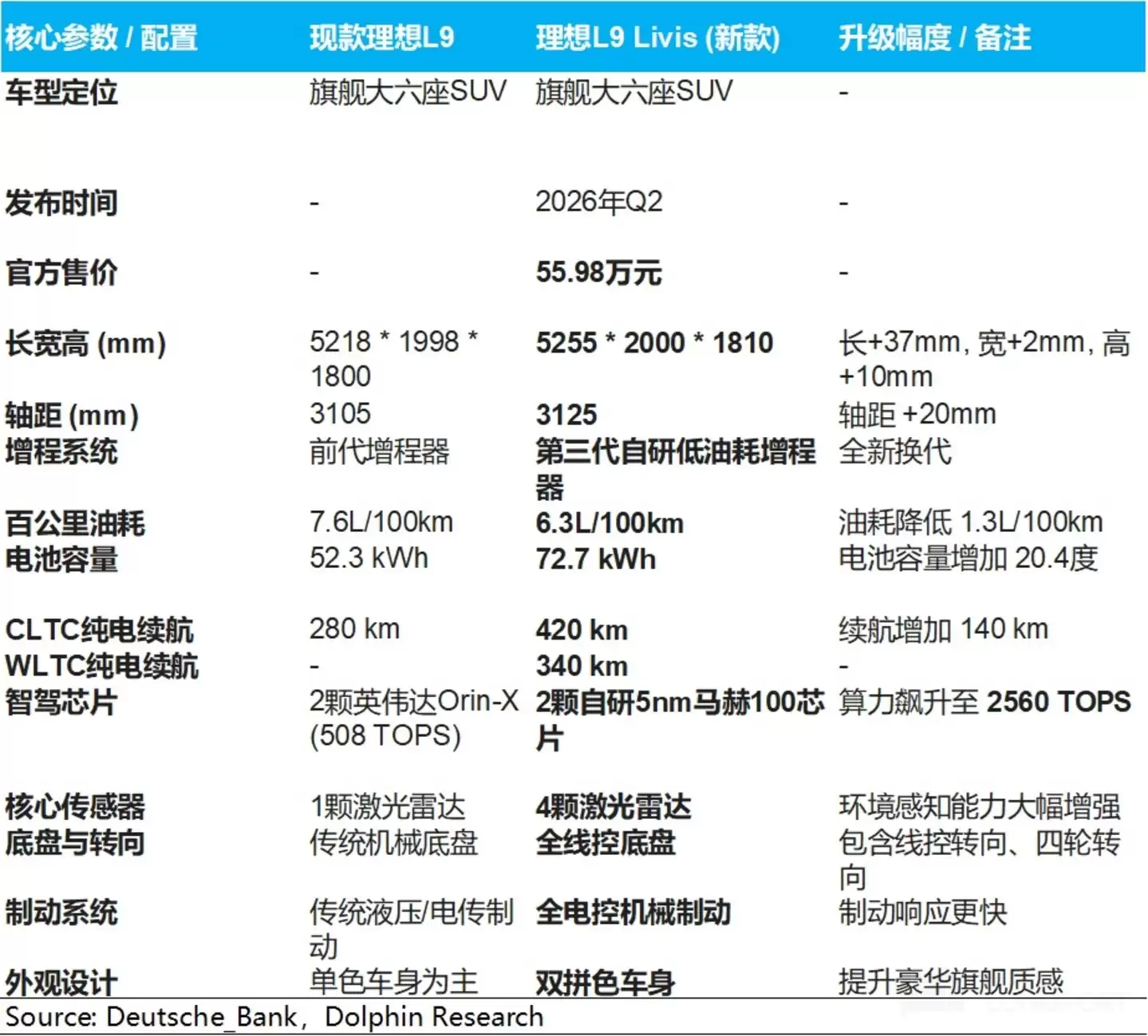 而从目前已经发布的L9系列来看,理想实现了全面增配(a. 加大车型尺寸;b. 大幅加大电池和纯电续航,增城系统换代降低油耗;c. 自研2560 TOPS马赫芯片即将上车;d. 升级线控地盘(支持四轮转向)和机械制动系统等)。