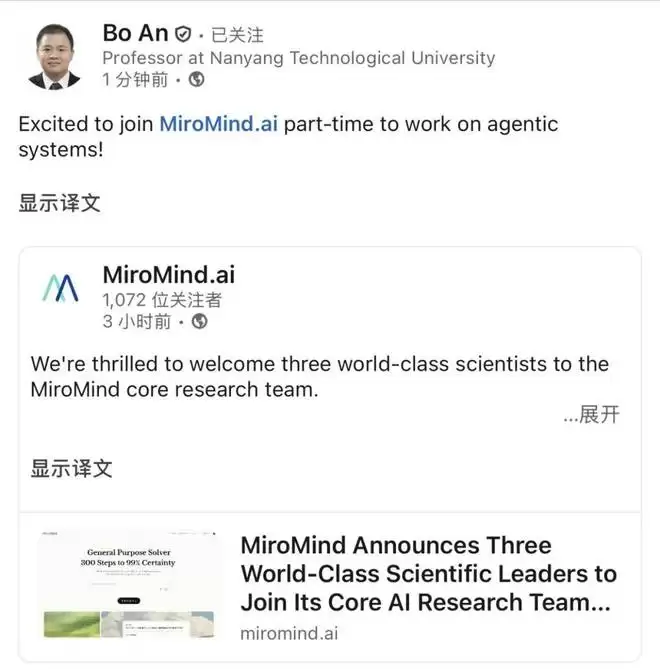 就在刚刚,MiroMind 在其正式宣布了三位杰出的 AI 科学家加入领导团队。这几项重要任命标志着 MiroMind 在构建“发现式智能”(Discoverable Intelligence)的使命上迈出关键一步 —— 一种不仅能分析已有知识,还能进行预测并探索全新概念的 AI。随着杜少雷博士出任Lead Scientist for Reasoning Models & Training安波教授出任Lead Scientist for Runtime & Agent Systems,以及杨凯峪博士出任Lead Scientist of the Verifiable AI Lab,MiroMind 正在打造的 Heavy Duty Solver 引擎的三大核心技术支柱现已全部就位。