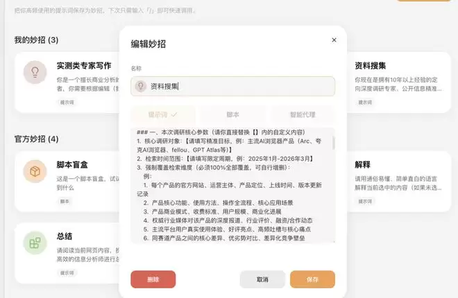 妙招功能往前走了一步。普通妙招保存的是提示词,脚本妙招保存的是能力——用户可以根据自己的个性化需求,自定义“插件”,随时做、随时用。
