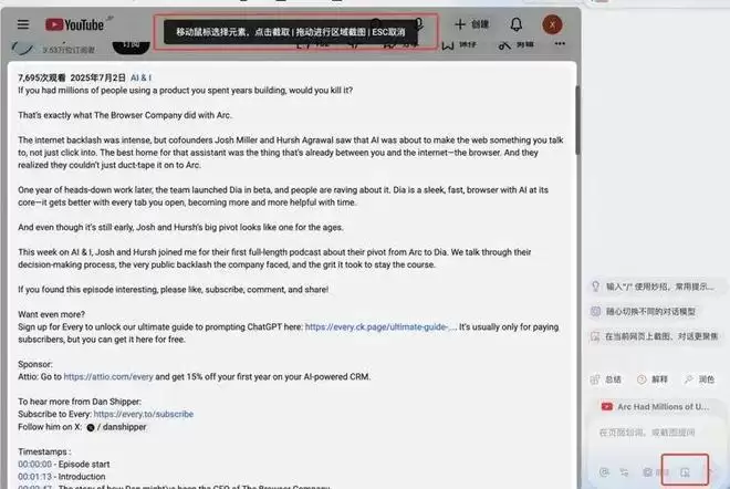 第一是,我可以打开报告中的任意链接,针对网页截屏,或是划线选中某段文字,直接注入Chat对话中,让AI就这段具体内容展开分析,上下文始终连贯。