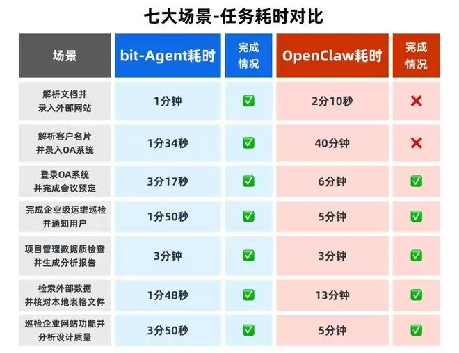 不难注意到,在两者共同跑通的场景里,bit-Agent的耗时皆优于OpenClaw,在个别场景中的耗时甚至不到后者的一半。