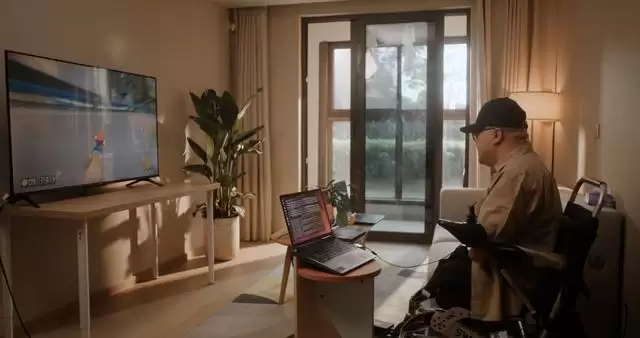 中国首例侵入式脑机接口临床试验受试者术后一个月脑控玩赛车游戏。
