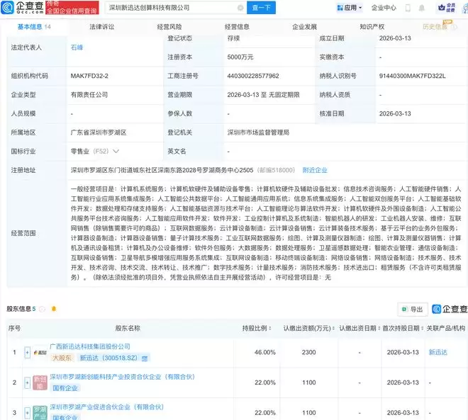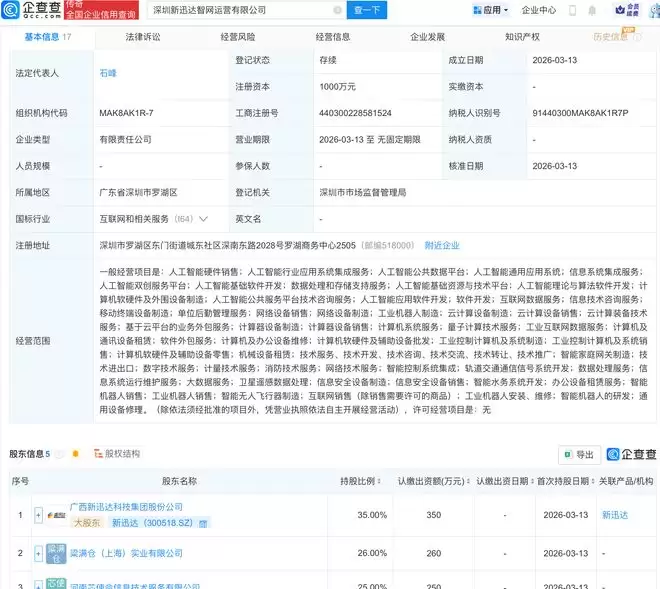 企查查APP最新信息显示,近日,深圳新迅达创算科技有限公司和深圳新迅达智网运营有限公司相继成立。两家公司的经营范围均涵盖人工智能公共数据平台、人工智能通用应用系统以及智能机器人研发等领域。根据企查查股权穿透信息,这两家企业均由新迅达(股票代码:300518.SZ)及其他股东共同持股。