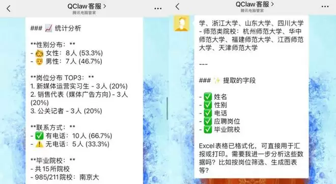 接下来我给它安排了第二个任务。桌面上有一批简历,我让QClaw:提取姓名、电话、性别、应聘岗位和毕业院校,并整理成一张招聘统计表。