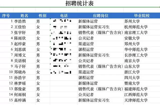 不仅如此,它还顺手生成了一份简单的统计分析。比如在这批简历中,女性8人、男性7人;岗位分布上,“新媒体运营实习生”“销售代表(媒体广告方向)”和“公关记者”并列最多;在联系方式方面,10人留下电话、5人没有填写。同时,毕业院校类型也做了简单分类。