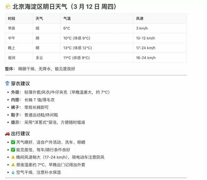 很快,一份整理好的天气报告就生成了出来,同时还带上了穿衣建议和出行建议。
