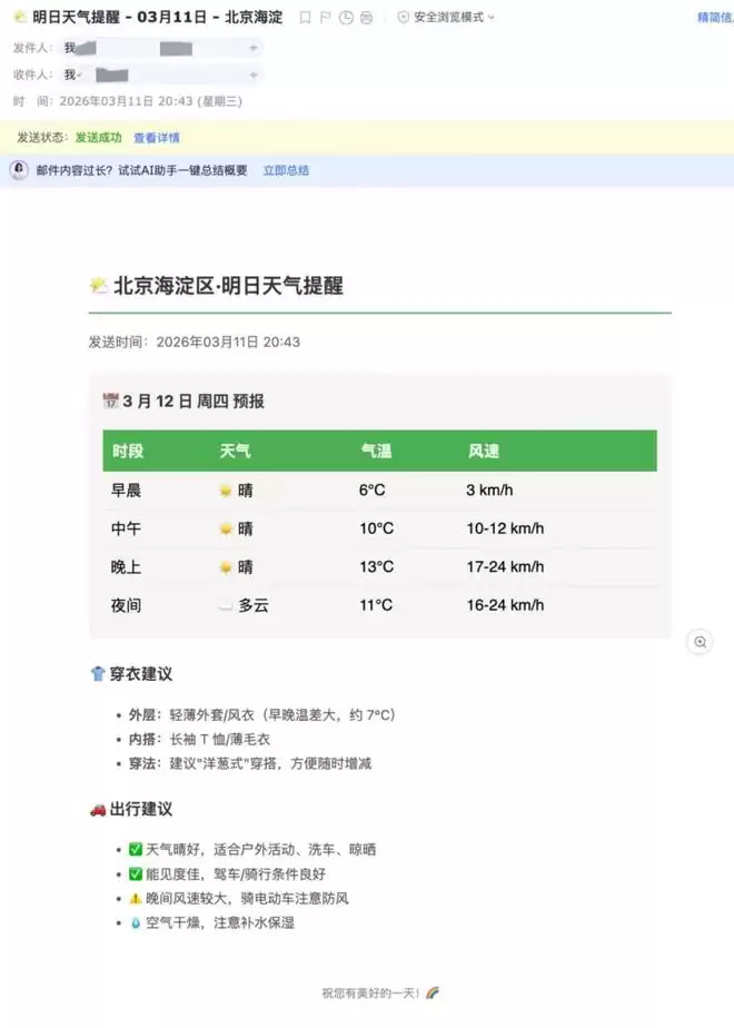 整个过程下来,从查天气、发现缺少插件、自动安装技能,再到发送邮件、创建定时任务,基本都由QClaw自己完成。从今晚开始,我每天都会在固定时间收到一封自动天气提醒邮件。