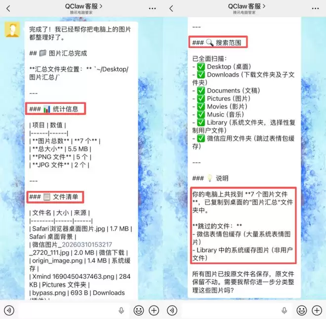 消息发出去后,QClaw很快开始扫描本地文件系统。它先在桌面、下载、文稿、图片、系统库以及微信缓存等多个目录中搜索图片文件,同时自动过滤掉系统缓存和表情包等无关内容。