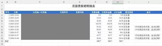 QClaw很快读取了文件夹里的材料,并在桌面生成了一张新的报销表。表格里每一行对应一笔交通费用,发票金额和行程金额已经自动匹配,费用类型也统一标注为“打车费”,并计算出了总金额。