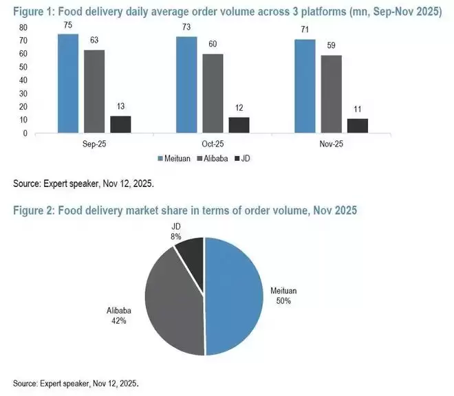 摩根大通调研数据显示,以去年11月补贴退潮后,美团守住50%的基本盘,饿了么+淘宝闪购凭借生态协同冲到42%,京东则快速滑落至8%。
