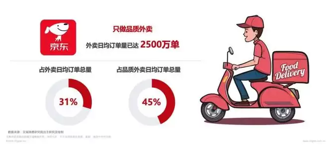艾瑞咨询数据显示,京东外卖在2025年取得了显著增长,日均订单量突破2500万单,覆盖全国350个城市,用户数超过2.4亿,在品质外卖细分领域占据45%的市场份额。