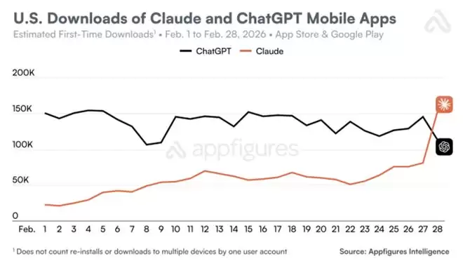 受抵制运动影响,大量用户开始转向被认为更具“道德底线”的竞争对手Anthropic。2月28日,在OpenAI宣布与美国国防部合作当天,ChatGPT移动端单日卸载量激增295%,应用商店一星评价暴增775%,五星好评则腰斩了50%。与此同时,Claude在美国的下载量首次超越ChatGPT,登顶苹果应用商店免费榜榜首。