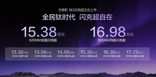 据IT之家3月13日消息,比亚迪方程豹豹3闪充版于今晚正式上市,推出续航620公里的后驱闪充版和565公里的四驱闪充版,显著提升了车主的补能体验,售价从15.38万元起。