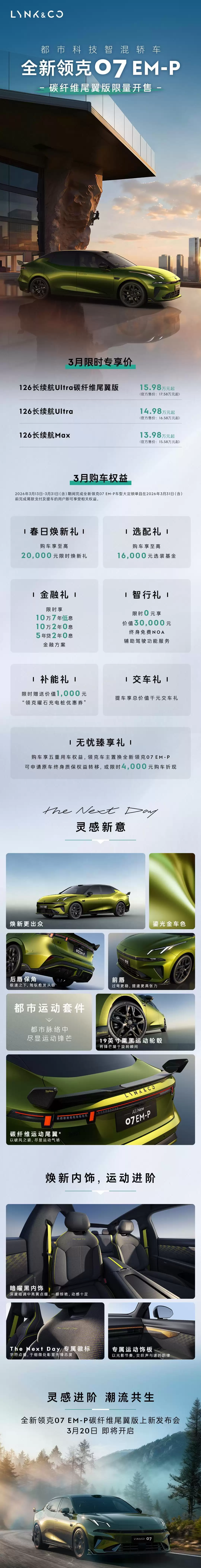 IT之家3月13日消息,全新领克07 EM-P碳纤维尾翼版于今天下午正式开启限量发售,官方最新指导价为17.58万元起。本月购车可享限时专属价,仅需15.98万元起。