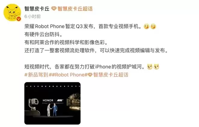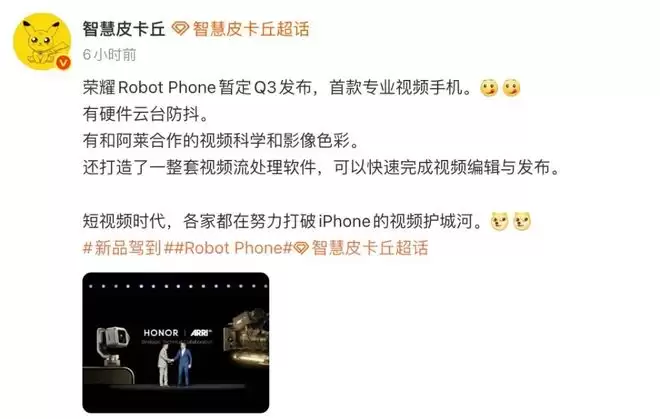 除了全新的荣耀Magic V6手机外,博主@智慧皮卡丘 的一份新消息显示:“荣耀Robot Phone暂定Q3发布,首款专业视频手机。有硬件云台防抖。有和阿莱合作的视频科学和影像色彩。还打造了一整套视频流处理软件,可以快速完成视频编辑与发布。”