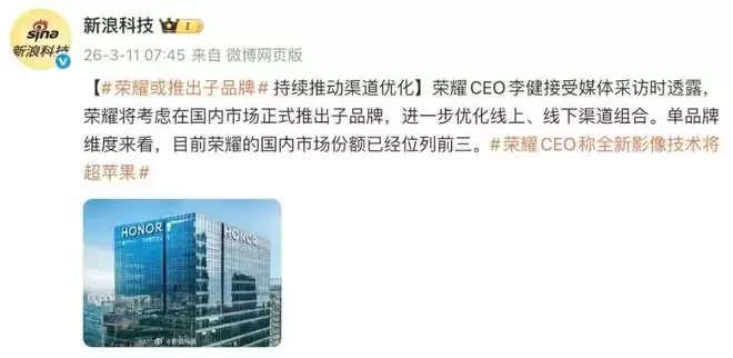 除此之外,新浪科技的报道显示,荣耀CEO李健接受媒体采访时透露,荣耀将考虑在国内市场正式推出子品牌,进一步优化线上、线下渠道组合。