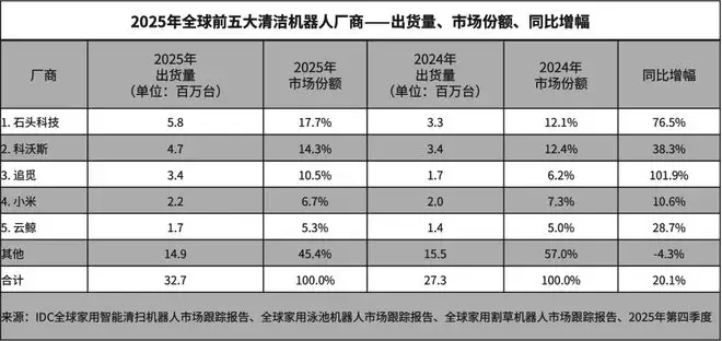 IDC报告显示:2025年,石头科技扫地机器人全球出货量位列第一,同时在美国、德国、韩国等多个核心市场位列第一。