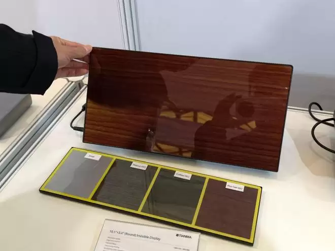 在AWE天马展区,我们看到了一种比较有意思的面板方案。天马展出了木纹样式的屏幕面板,这是一种隐形显示技术。具体来说,它在显示面板上加装了一层高透光率的装饰层。这样一来,屏幕不显示内容时,它看起来就像是木质装饰品;显示内容时,它又可以和普通屏幕一样工作。