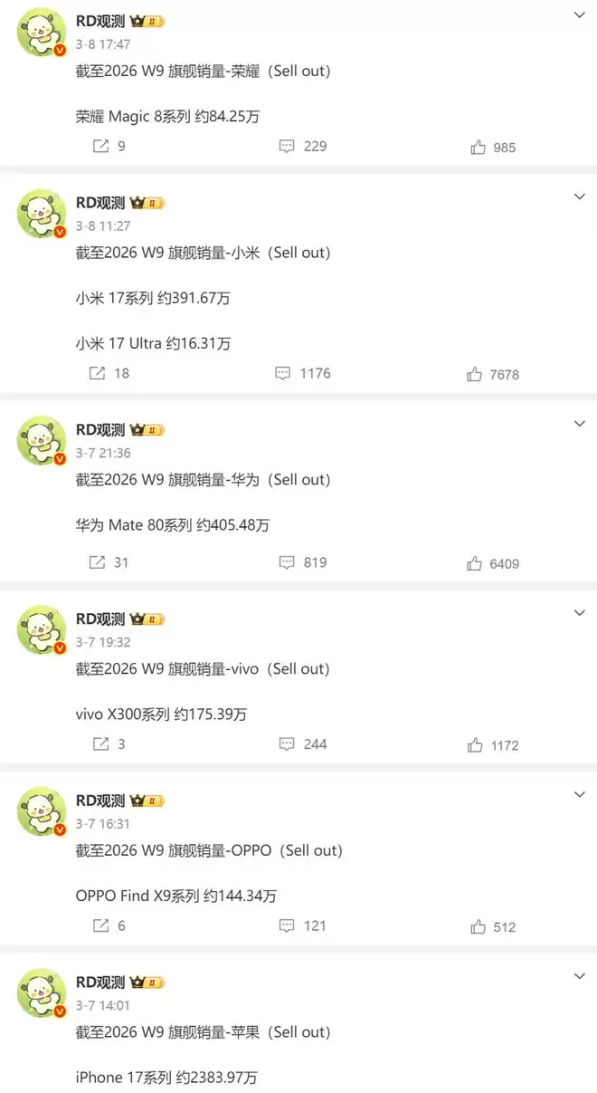 长期跟踪市场份额的博主“RD观测”给出了更残酷的数字,截至第9周,iPhone 17系列国内销量约2383.97万台。