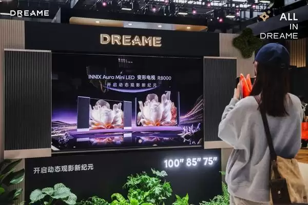 在追觅展台,最吸引观众驻足的,是首次搭载动态声擎技术的INNIX Aura Mini LED R8000系列“变形电视”。