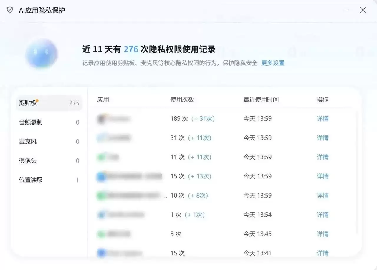 例如,新增的“AI应用隐私保护”功能,能够可视化展示各类应用(包括AI应用)的数据权限访问记录。