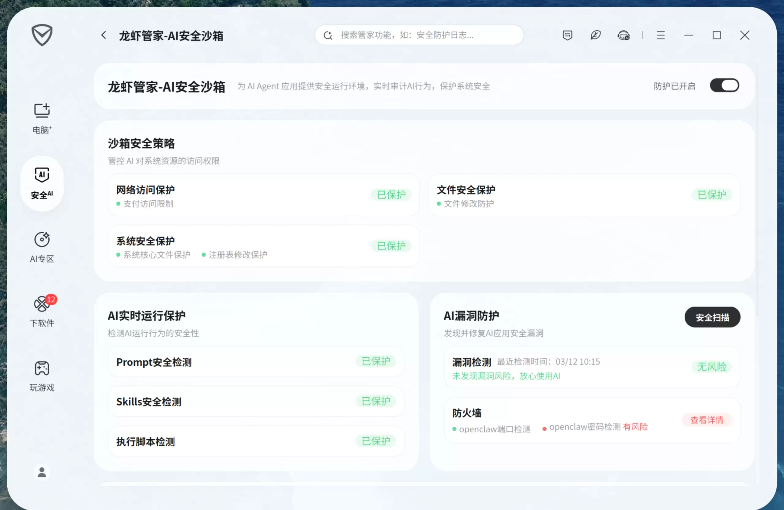 用户无需进行复杂配置,即可开启多重保护,覆盖系统安全、Skills安全、支付安全、Prompt安全等多个维度,实现AI应用的隔离运行、全程防护与行为溯源。