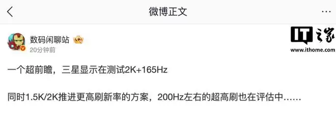 IT之家3月14日消息,博主@数码闲聊站今日在微博透露,三星显示正在测试2K+165Hz面板。