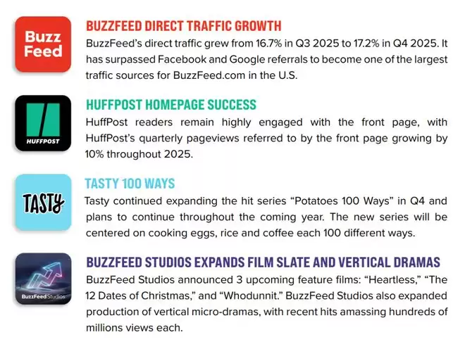 本周,曾定义了 2010 年代全球流行文化的媒体巨头BuzzFeed发布了 Q4 及 2025 年全年财报,公司正式发出“重大持续经营疑虑”警告:“如果没有战略选项,我们预计在接下来 12 个月内将没有足够资源履行现金义务。” 它直接放弃了 2026 年业绩指引,转而“评估战略选项”。市场解读为:分拆、出售资产、被收购,甚至破产清算......