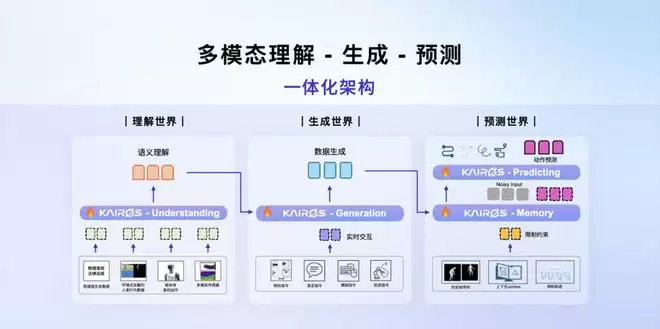 作为业内首个实现“多模态理解—生成—预测”一体化的开源具身原生世界模型,Kairos 3.0-4B并非在大语言或视觉模型后简单附加运动接口,而是从架构底层为机器人在真实世界的运行进行设计,以自然界基本物理规律与因果规律为认知根基,构建起跨本体的统一世界理解框架,打破传统具身智能“行为模仿”的技术局限,将模型能力升级至“物理级深度理解”的全新维度。