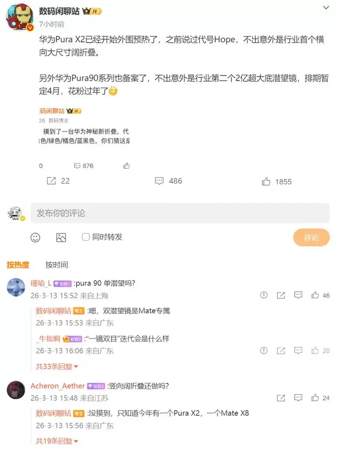 而两款产品的时间线目前看来是交错的,华为Pura X2已经开始外围预热,Pura 90系列备案落地,不出意外的话,4月会迎来一波密集发布。